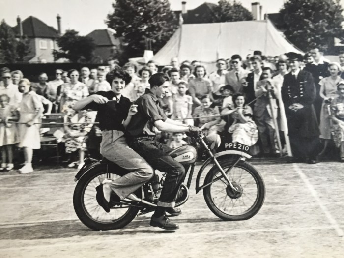 My Father (and egg carrier) in the “Egg and Spoon” motorcycle race on a BSA Bantam 125 in the 1950s…..uncomplicated fun in a less complicated world.